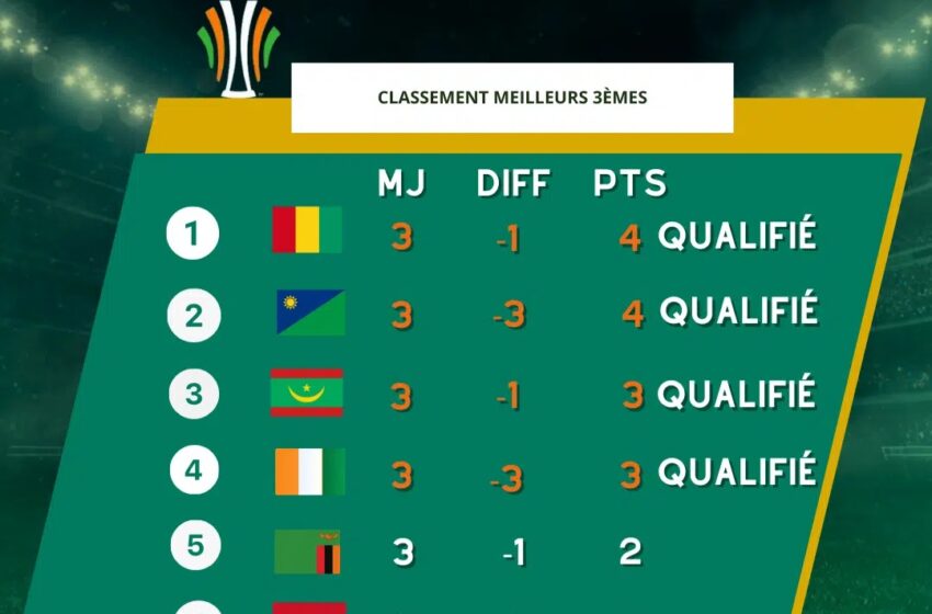 CAN 2024 Classement Des Meilleurs Troisièmes , La 34e édition de la coupe d’afrique des nations de football se déroule du 13 janvier au 11 février dans cinq villes en côte d’ivoire.